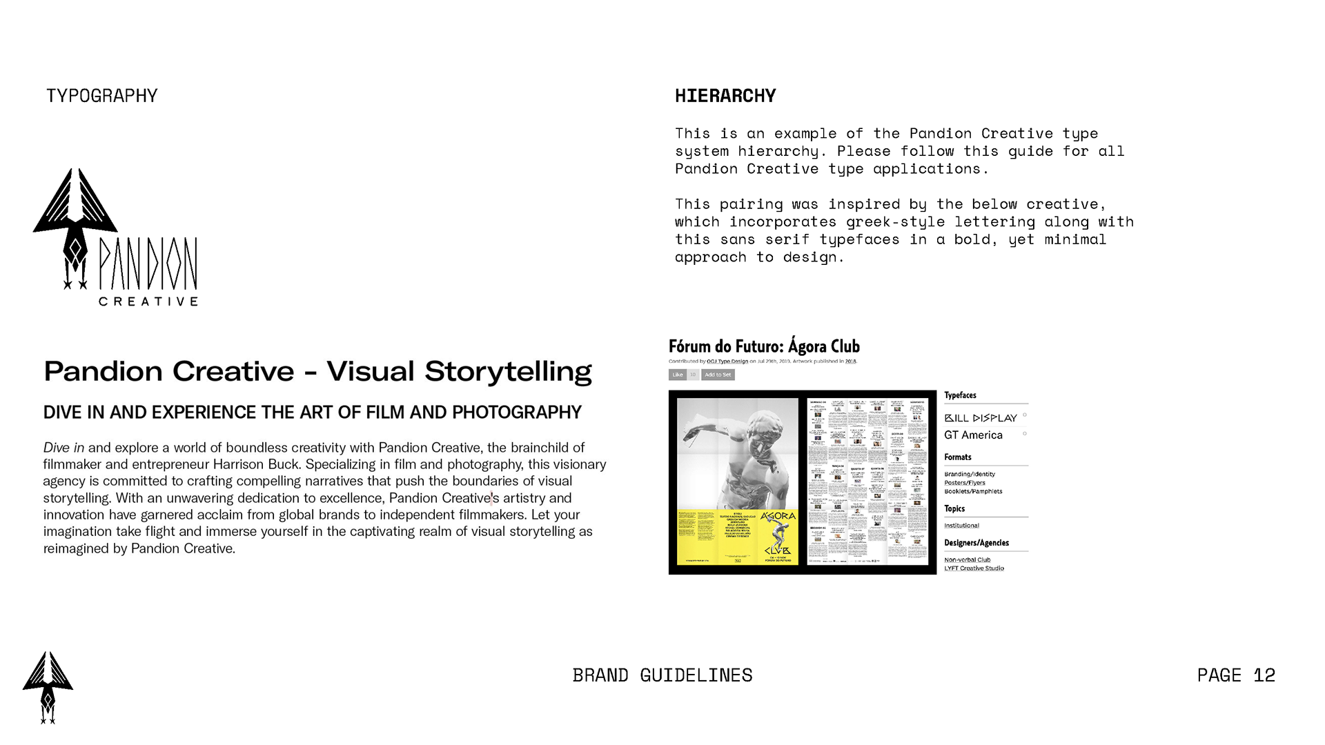 A few pages from the Brand Guidelines that were created along with the logo and branding for production company, Pandion Creative.